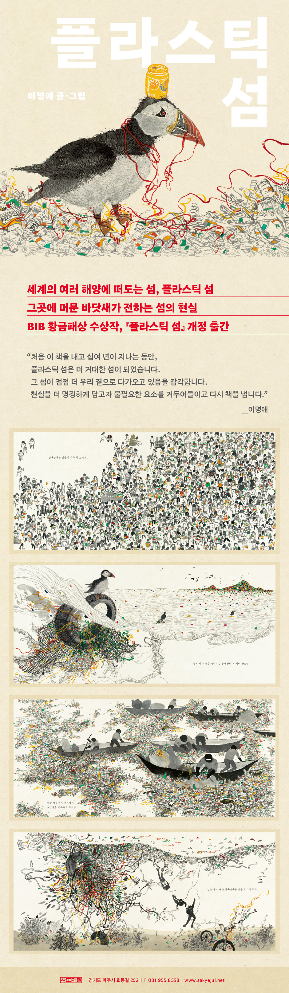 This picture book tells this serious story through the mouths of one seabird. Under the gentle and calm text that begins with “On the island where I live,” the pictures gradually reflect trucks transporting waste, colorful scenes of life, the distant sea where colorful debris gathers, and birds naively exploring. The contrast between the colorful artificial colors, the sea that has lost its blue, and the nature unified in black delivers the message contained in this book even more powerfully. This is also the biggest change in this revised edition.