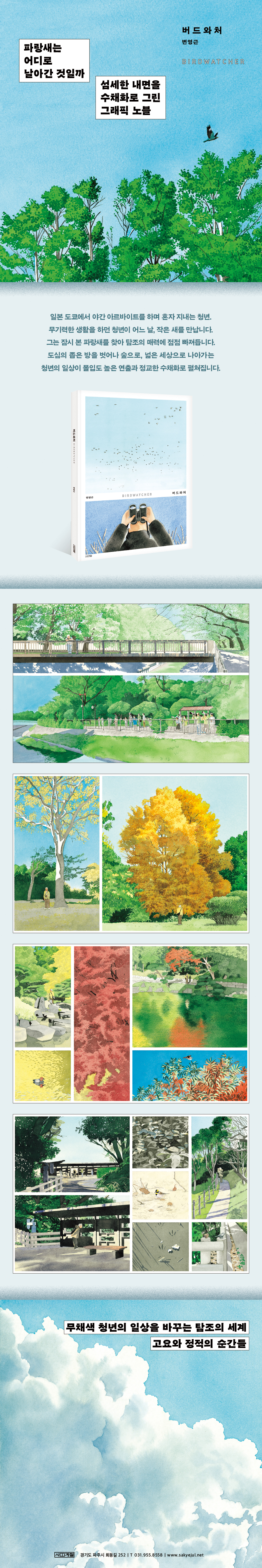In the winter of 2022, the author began birdwatching in Japan and has since continued the activity weekly. As noted in the author’s statement, the moment he first met birdwatchers in Japan—"a memory of seeing many rare birds and rare people"—became the starting point for Birdwatcher, ultimately leading the author into the world of birdwayching. At the end of the book, the names of 60 bird species featured in the story are listed. The artist conducted extensive field research and birdwatching from parks, gardens, and botanical gardens in Tokyo, Japan, to Gunsan and Cheolwon in Korea, resulting in a rich and layered narrative.